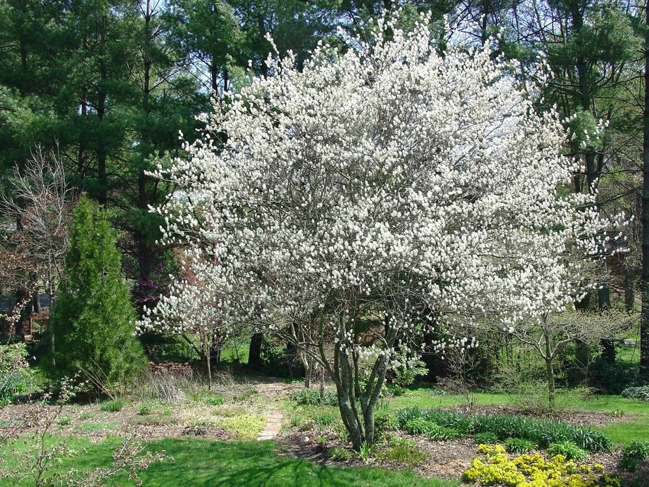 Arbuste au port arrondi, feuillage vert moyen, Fleurs blanches mai-juin Fruits rouges comestibles Z: 4 H: 7 L: 6